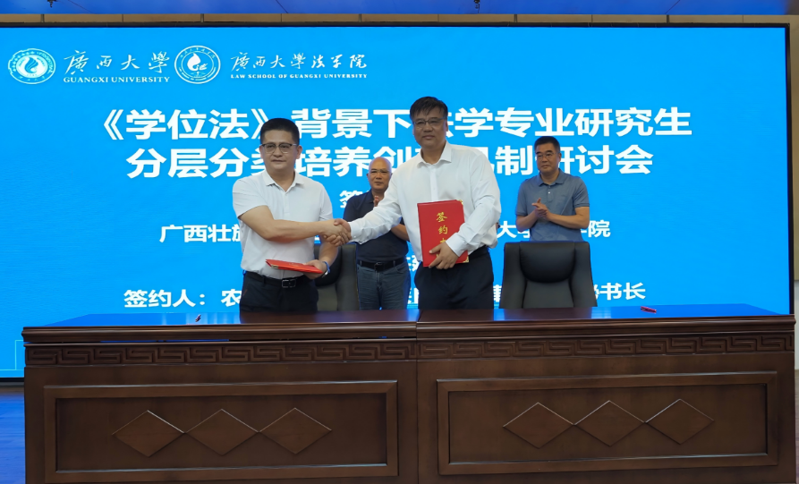 广西律师协会秘书长农锋华(左)与万象城allwincity官网院长许光耀签订合作共建协议