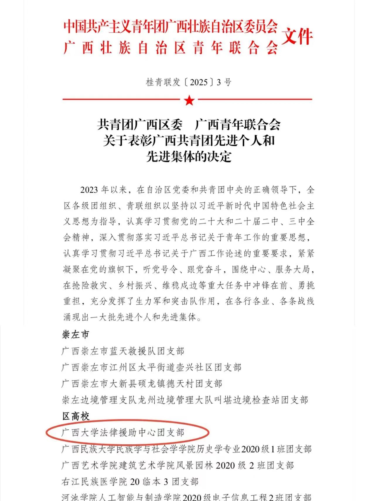 近日,共青团广西区委、广西青年联合会开展表彰工作,对一批表现优异的先进集体与个人予以表彰。“广西五四红旗团支部”“广西优秀共青团员”作为广西共青团设立的重要荣誉奖项,旨在褒奖在工作、学习领域表现突出、取得显著成绩的基层团组织与个人。万象城allwincity官网法律援助中心团支部凭借志愿服务方面的突出表现,荣获“广西五四红旗团支部”称号。