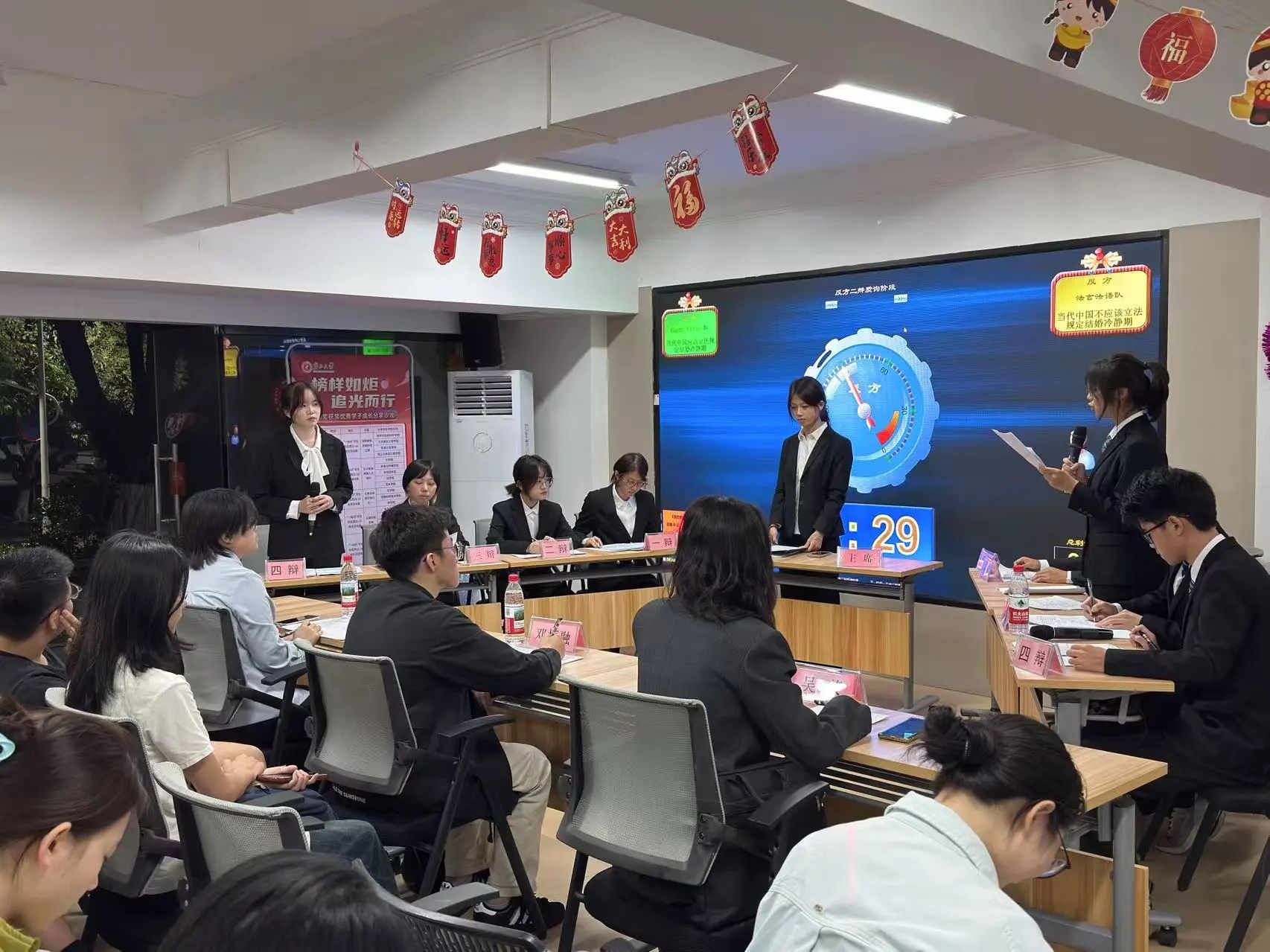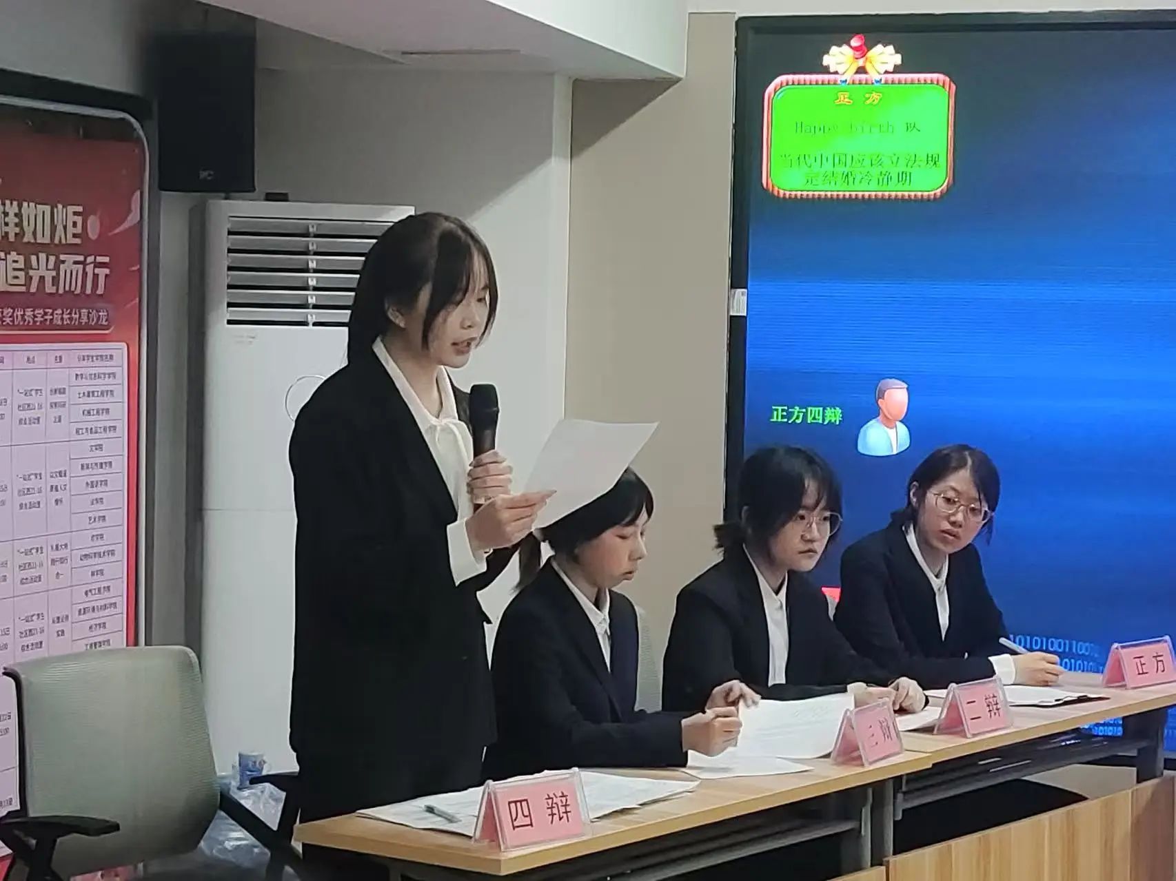 为了提升学生思辨能力、深化法治实践认知,2025年4月12日晚19时30分,万象城allwincity官网辩论赛决赛于一站式学生社区西 21-16 号教室举行。本次决赛的辩题是“当今中国是否应该立法规定结婚冷静期”。经过前期的激烈角逐,“法言法语队”与“Happy birth队”脱颖而出,晋级决赛。