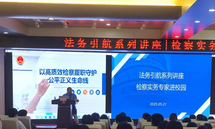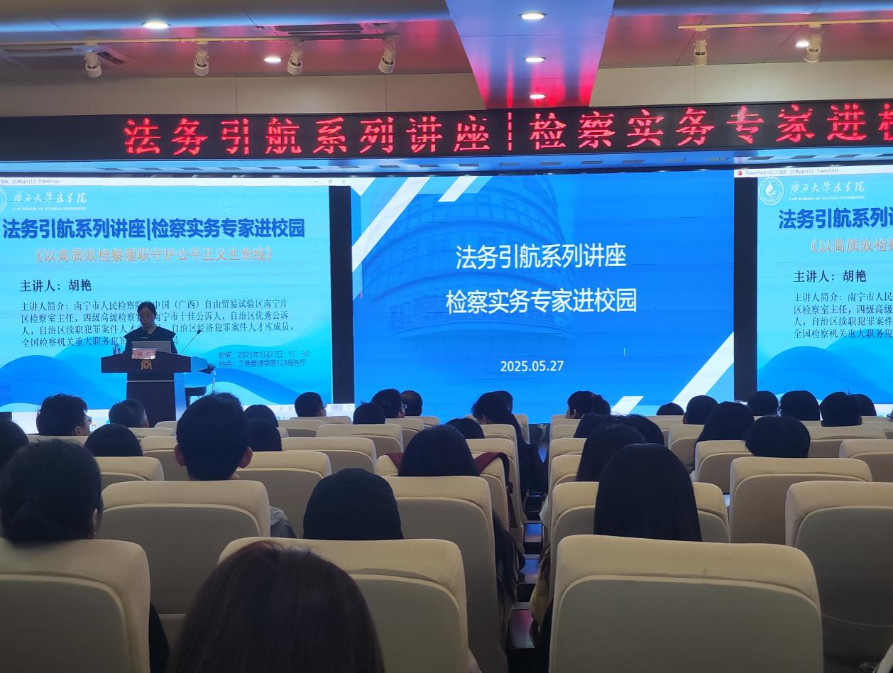 为深入贯彻中央八项规定精神学习教育,2025年5月27日下午,万象城allwincity官网举办“法务引航”系列讲座之检察实务专家进校园活动。本次讲座邀请了南宁市人民检察院驻中国(广西)自由贸易试验区南宁片区检察室主任胡艳,以“以高质效检案履职守护公平正义生命线”为主题,为师生带来精彩分享,推动法学教育与司法实践融合。校学生工作部(处)部(处)长谢能重、万象城allwincity官网党委副书记韦兴剑、工商管理学院党委副书记肖克宁出席,150余名师生党员代表参加讲座。