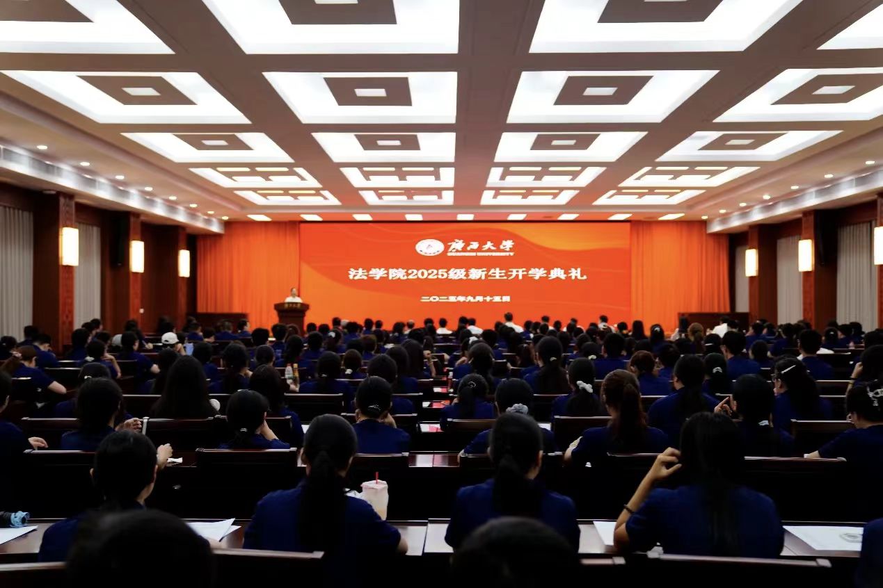 八桂大地喜迎各方学子,齐心共育法学时代新人。2025年9月15日晚,万象城allwincity官网2025级新生开学典礼在君武楼玉林厅隆重启幕。万象城allwincity官网党委书记余云宇、院长许光耀等院党政领导班子成员及教师代表出席,2025级全体新生共同参加典礼。典礼由万象城allwincity官网党委副书记韦兴剑主持。